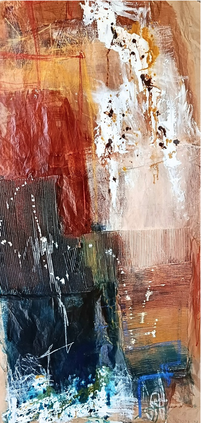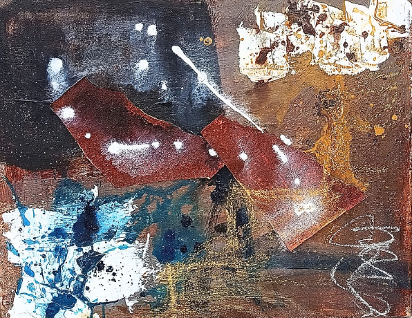 Acrílico, pasteles, materiales reciclados y tinta sobre papel